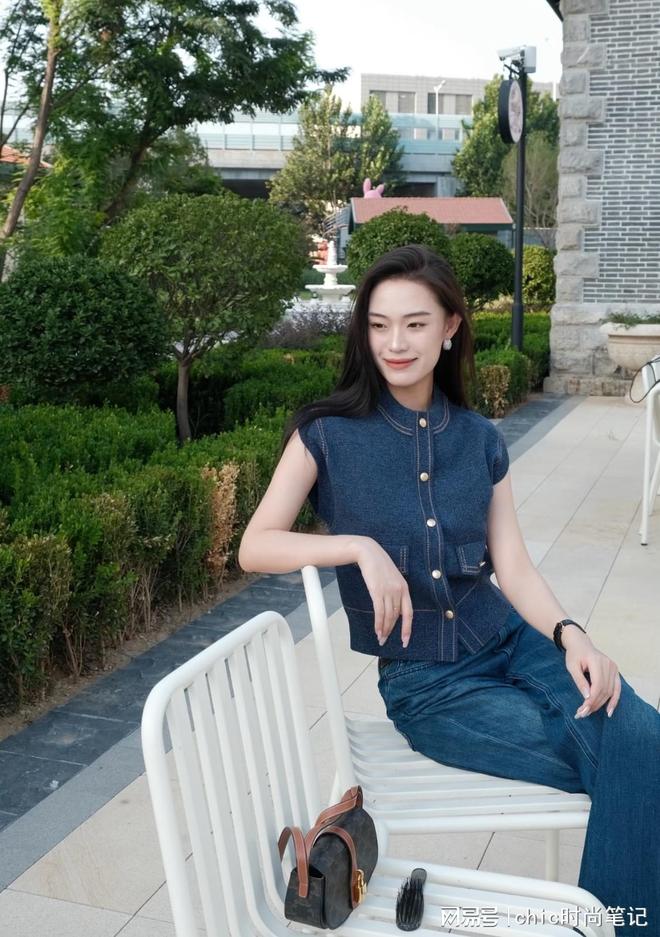 精致立体的牛仔上衣搭配深色牛仔裤,丹宁牛仔上衣搭配金丝线和金色纽扣,优雅且贵气,看似简单、随性的一套look,实则质感满满。