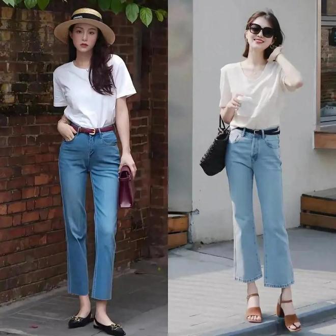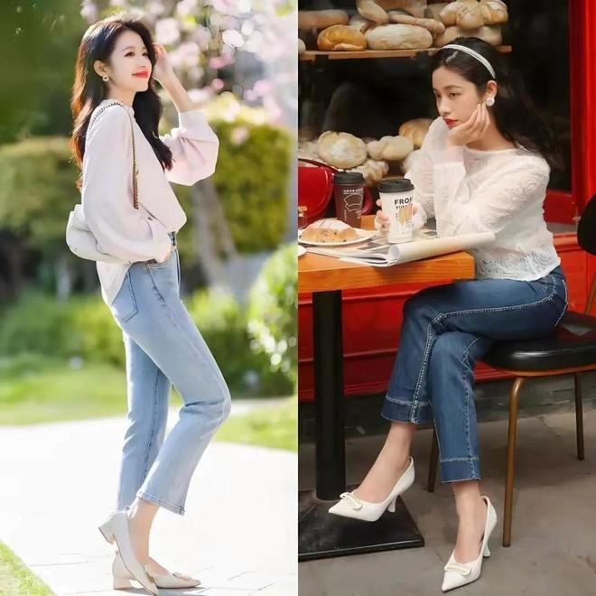 下面这两位博主小众设计的衬衫上衣搭配九分牛仔裤,脚上穿着一双白色的低跟单鞋,搭配大波浪的卷发造型,展现出来女神气质范。