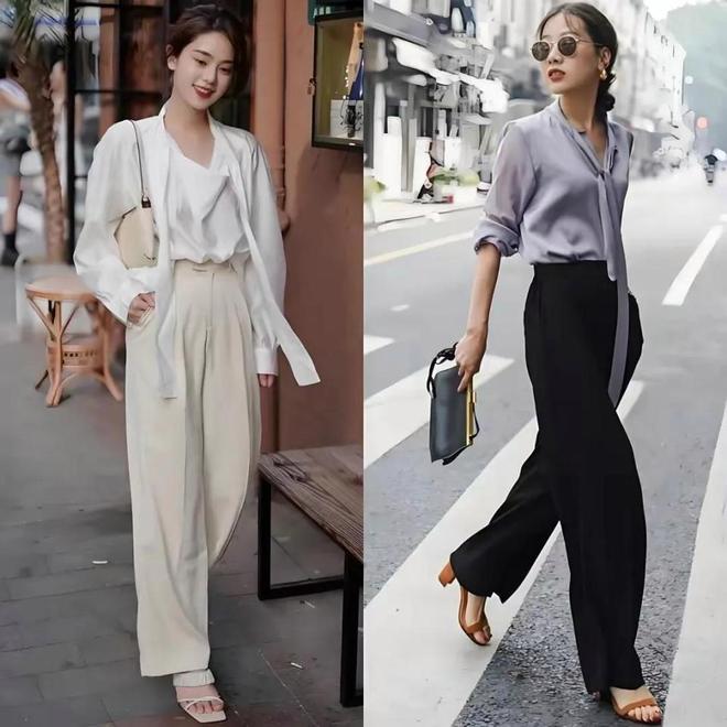 当然啦,选对象时衣服色彩也很关键,比如说下面这2套,虽然用黑色衬衫和白色衬衫来穿搭,但没有直接选择黑色的西装裤,而是选择灰色和卡其色的阔腿裤来组合搭配,这样的衣服色彩穿搭会更加洋气,不会过于沉闷。