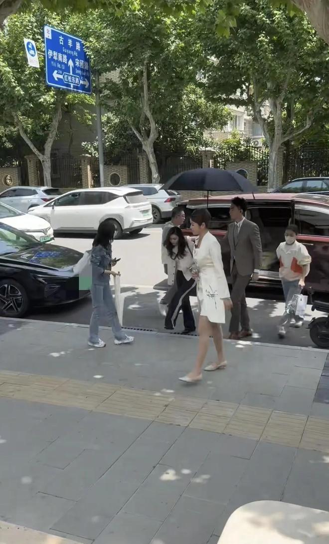 她从专车下来,有西装革履的帅哥帮忙打伞,旁边还有一位身材高挑的礼仪小姐姐给引路。