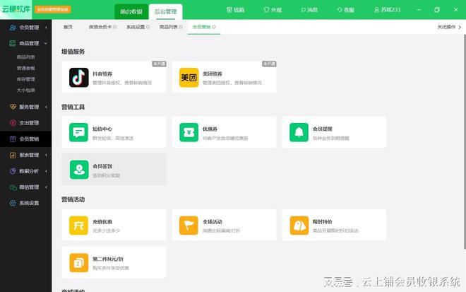 云上铺会员收银系统,作为新一代SAAS收银平台,满足了电脑收银、手机收银、平板收银、收银机等应用场景外,广泛适用于零售、美容、服装、教育、母婴、汽车服务、生活服务等多个行业。系统功能全面,涵盖商品管理、销售收银、库存管理、财务统计、会员营销等,支持多平台操作,数据实时同步。