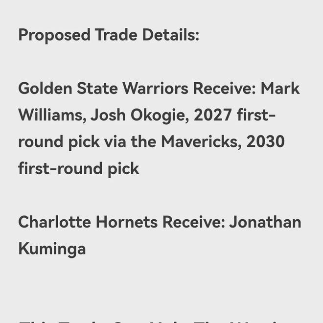 金州勇士队获得:马克威廉姆斯,乔什奥科吉,2027年首轮选秀权独行侠队,2030年首轮选秀权