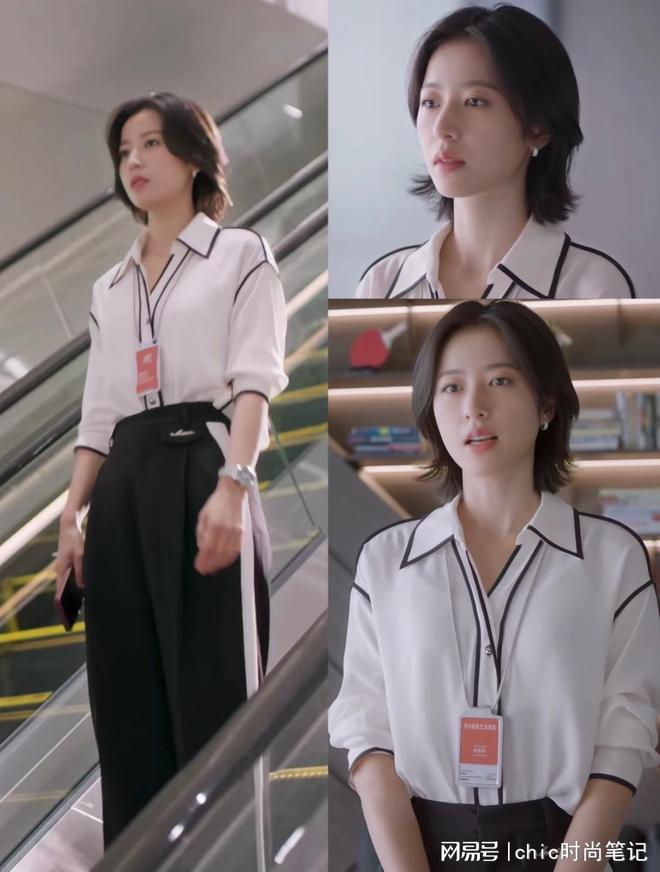 《爱情而已》里周雨彤的穿搭是非常经典的职场通勤风格,一套look也是来自于OVV,白色衬衫+黑色西裤,越是简单越能展现职场的干练和利落。