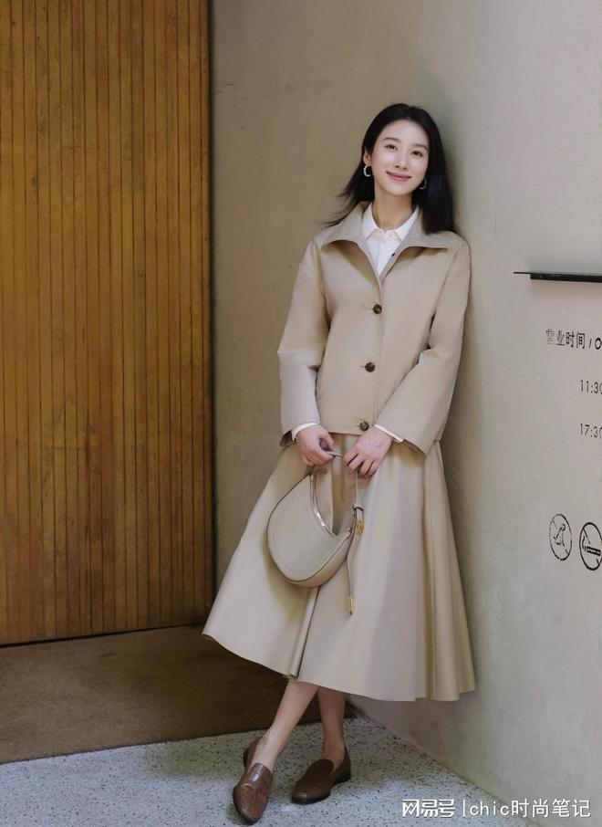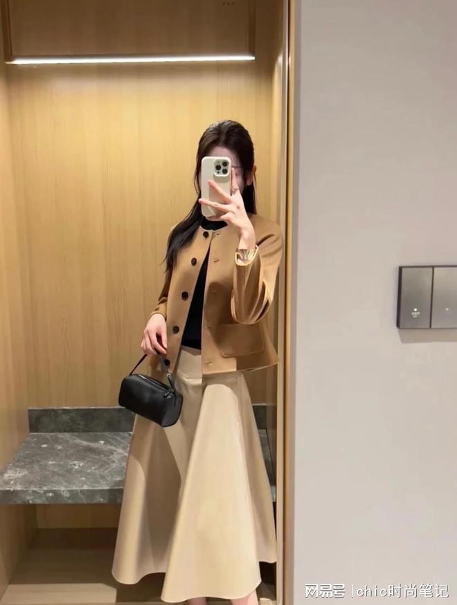 秋天是大地色系,驼色开衫搭配浅驼色半身伞裙,很有质感的 一套穿搭,深色和浅色的过度层次感与细节感绝佳。