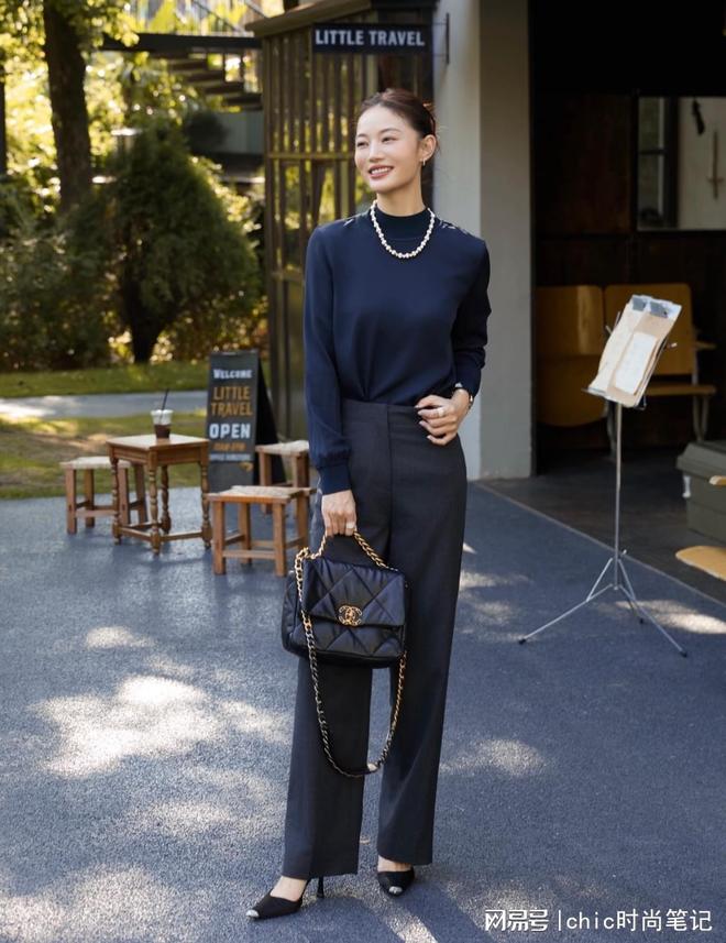 藏蓝色针织上衣搭配深灰色西裤,黑色包包和黑色高跟鞋的加持让整套穿搭在简约中透着优雅和干练,尤其是脖子上的珍珠项链点缀,让原本黑色系穿搭一下子亮堂起来。