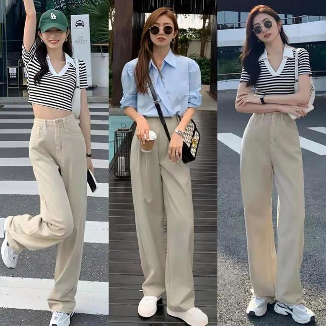 想要少女感爆棚的造型,你可以选择黑白条纹短袖T恤搭配卡其色直筒裤,再搭配一双白色运动休闲鞋,这样的穿搭谁能不爱。