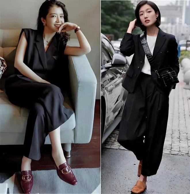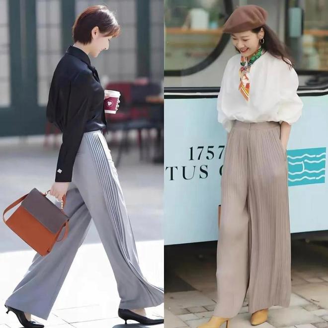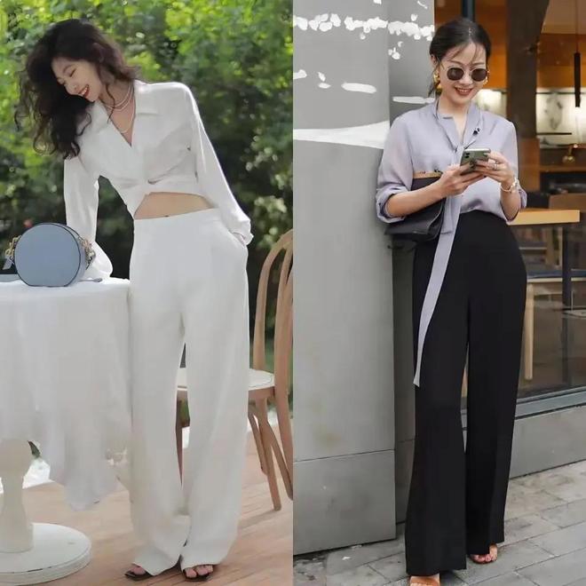 当然啦,选对象时衣服色彩也很关键,比如说下面这2套,虽然用黑色衬衫和白色衬衫来穿搭,但没有直接选择黑色的西装裤,而是选择灰色和卡其色的阔腿裤来组合搭配,这样的衣服色彩穿搭会更加洋气,不会过于沉闷。